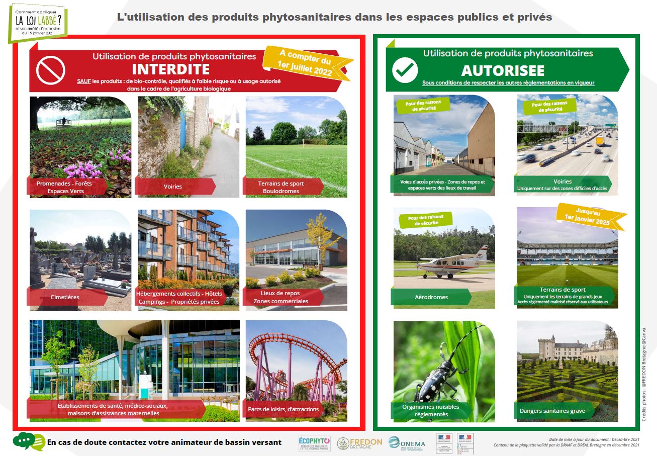 La loi Labbé du 6 février 2014, complétée par l’arrêté du 15 janvier 2021 va généraliser les interdictions d’usage des produits phytosanitaires* à l’ensemble des espaces ouverts au public qu’ils soient publics ou privés. A cette occasion une nouvelle plaquette «Loi labbé2 » a été créée.